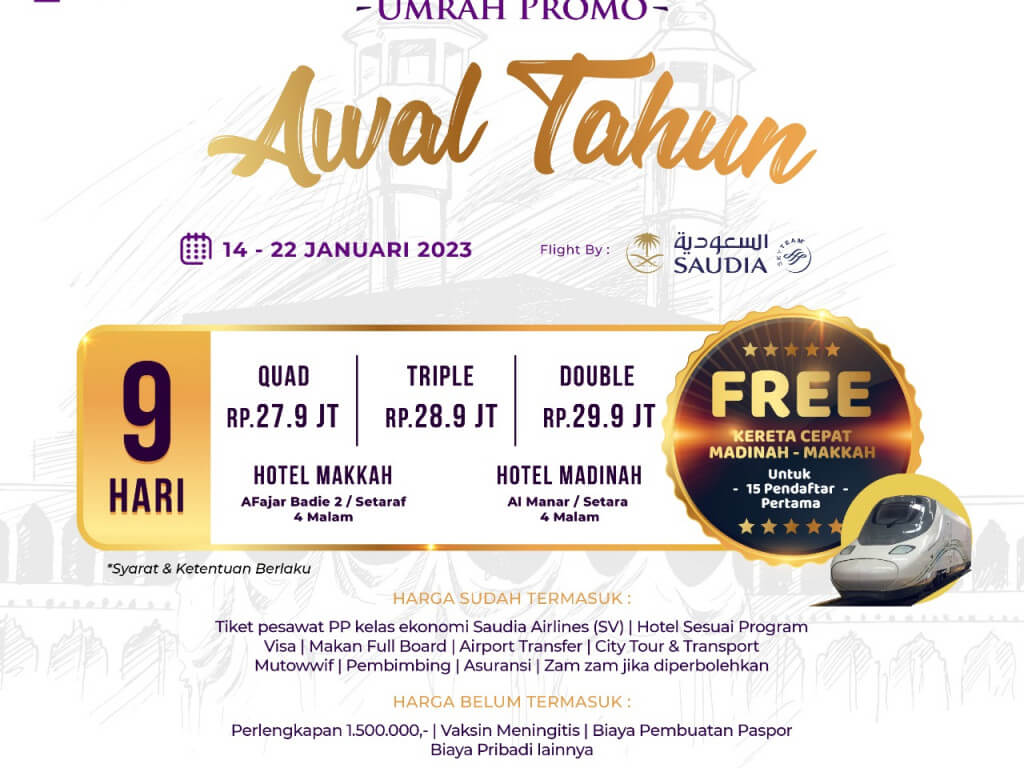 - Perlengkapan : Tas kabin, koper bagasi, tas Sandal, kain ihram/kerudung, seragam pria & wanita, buku manasik, syal, & sabuk